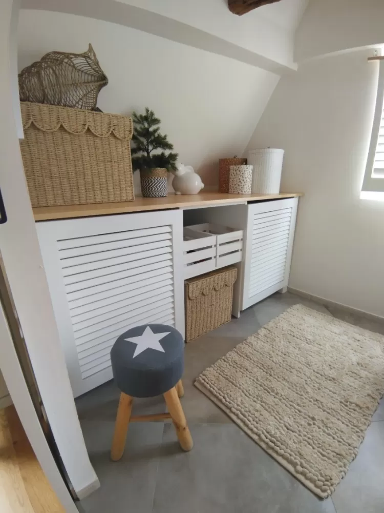 Création d'un placard pour machine à laver en bois massif avec porte battante avec jalousie .