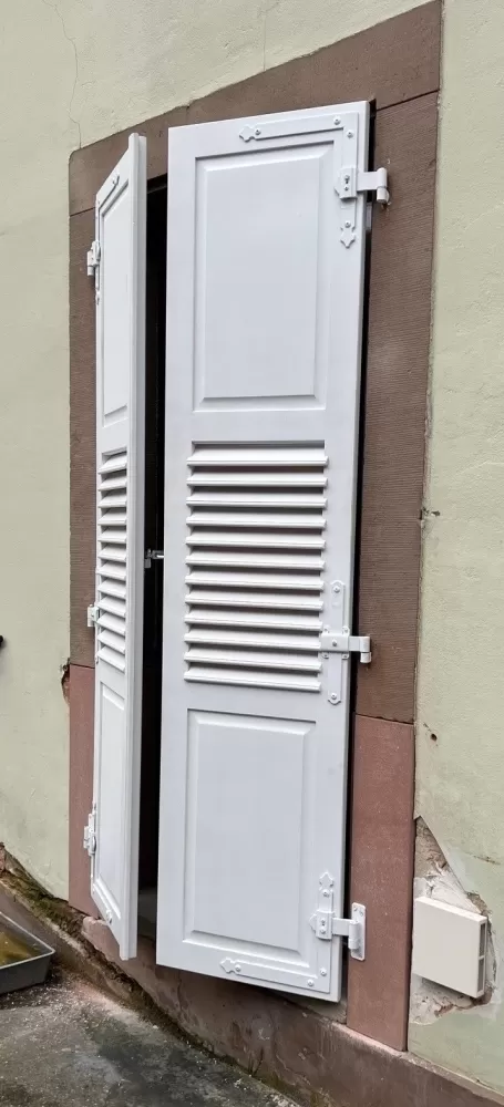 Création et pose de volet battants en bois avec jalousie à Woerth . Création à l'identique de nouveaux volets par rapport à ceux déjà existant .